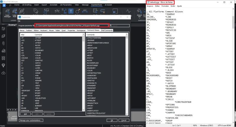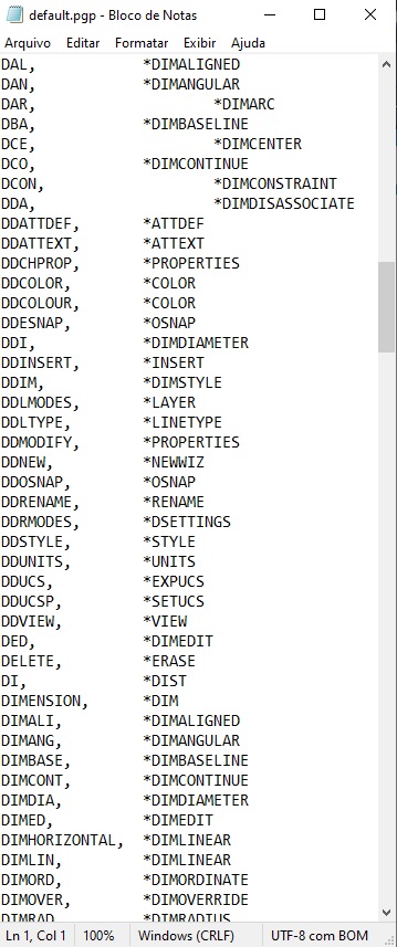 Archivo acad.pgp abierto en el Bloc de notas o WordPad