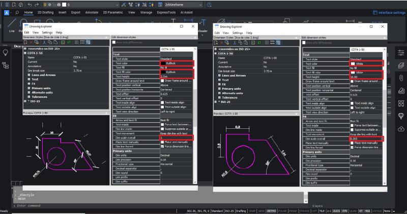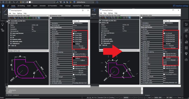 Para simplificar el proceso, vamos a definir valores predeterminados para todos los elementos de la cota (texto, flechas, líneas). La única configuración que cambia entre escalas es la escala de cota global, en la pestaña Ajustar, que ajusta proporcionalmente todos los elementos para la impresión.