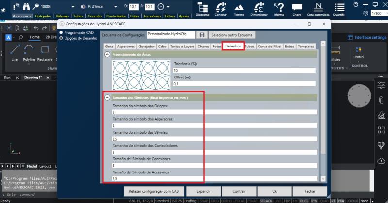 Pestaña Dibujos: ofrece opciones para modificar el tamaño de los símbolos de origen, aspersores, válvulas, controladores, conexiones y accesorios.