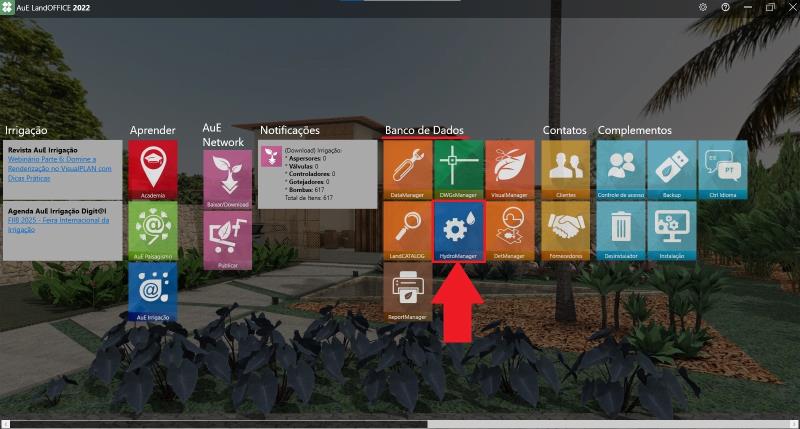 Inicie HydroManager desde el menú LandOFFICE. Esta herramienta gestiona la base de datos de riego, incluyendo boquillas y aspersores.