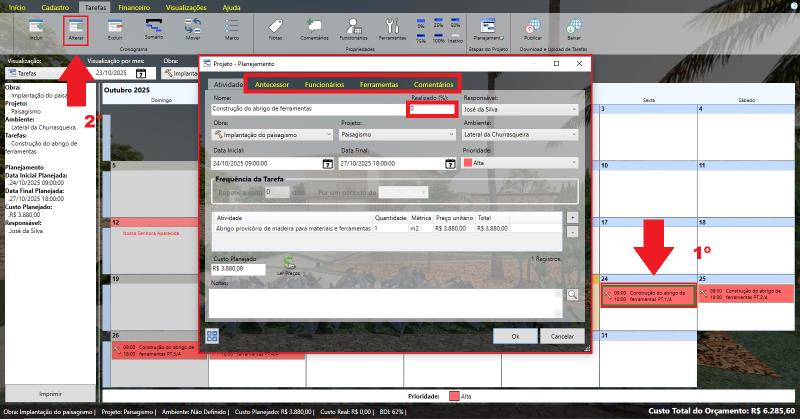 Al hacer clic en Modificar, también se muestran los cuadros de predecesor, que indican que una tarea solo puede iniciarse después de que se haya completado otra. Además, están disponibles las pestañas Empleados, Herramientas y Comentarios, así como la opción de informar sobre el progreso de la obra, indicando cuánto se ha ejecutado.