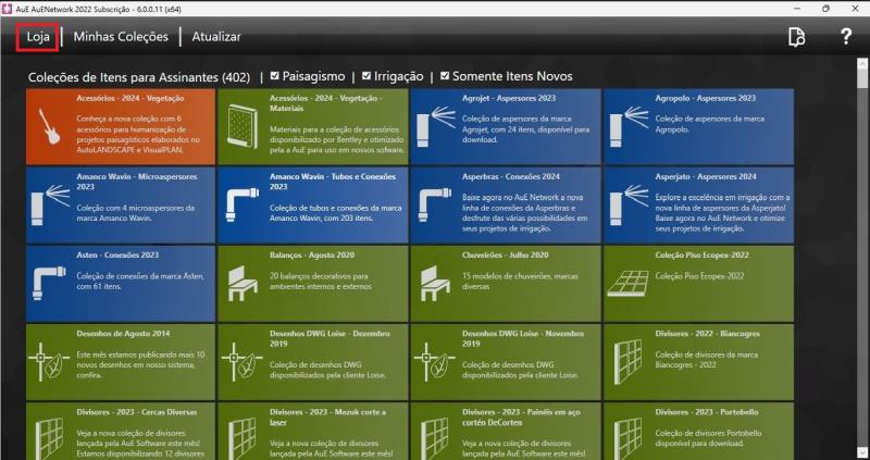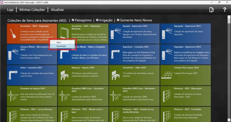 Marcar o desmarcar colecciones de Riego y Paisagismo, según el software utilizado;Visualizar el estado de las colecciones por colores: grises son colecciones ya bajas; verde colecciones nuevas de paisajismo; azul colecciones nuevas de riego y naranja las colecciones de accesorios y símbolos.Utilizando el filtro Solamente elementos nuevos, el sistema solo mostrará las colecciones que todavía no fueron descargadas.
