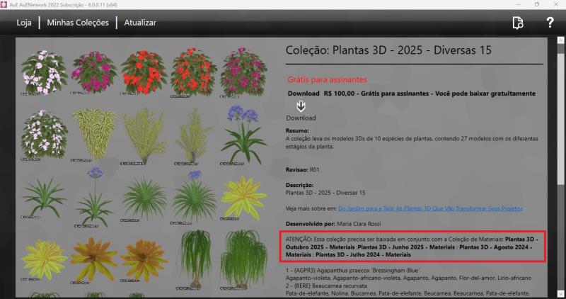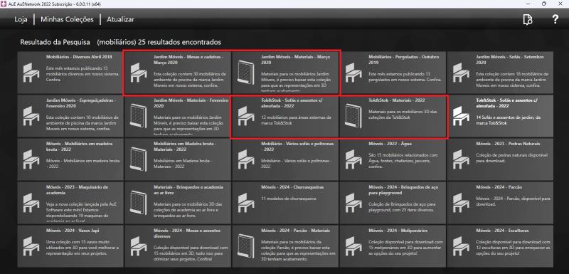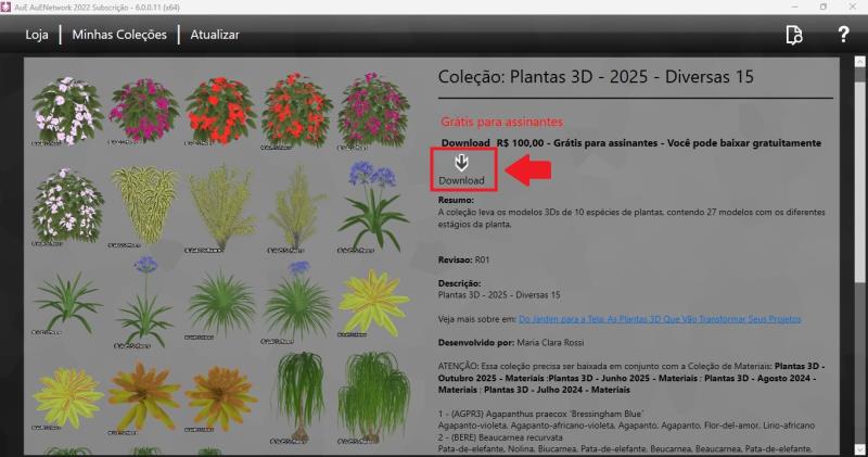 No es necesario esperar el término del dowload de la colección para continuar utilizando el software. Basta con mantener la ventana de la fila de descargas abierta hasta la conclusión. La ventana de AuE Network puede cerrarse sin problemas.Para paisajismo, las plantas, muebles, elementos en 3D es obligatorio descargar, la colección de los ítems 3D y sus respectivas colecciones de materiales (responsables por texturas y colores)