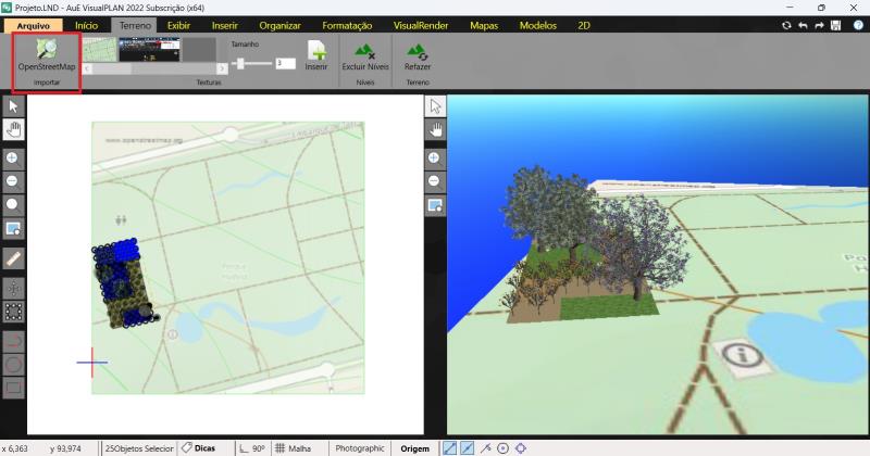 En la pestaña Terreno, la primera herramienta disponible es OpenStreetMap, que permite importar las curvas de nivel de un lugar real. Solo hay que introducir las coordenadas, el nombre del lugar o la dirección deseada para generar automáticamente las curvas de nivel en el proyecto.