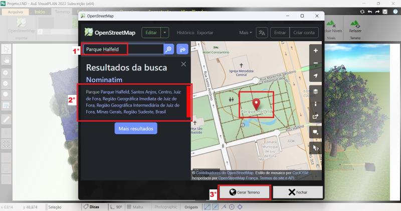 Después de realizar la búsqueda, haga clic en el resultado para seleccionar el área deseada y haga clic en Generar terreno. El sistema importará las curvas de nivel, que, aunque no se pueden seleccionar directamente para su edición, ofrecen una representación visual fiel y precisa de las variaciones del relieve.