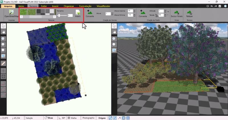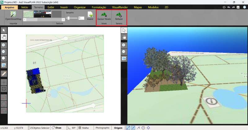 VisualPLAN 2022 ofrece, en la pestaña Terreno, varias herramientas que permiten crear y modelar el terreno de su proyecto directamente en el programa, haciéndolo más realista y con mayor precisión en elevaciones y texturas.