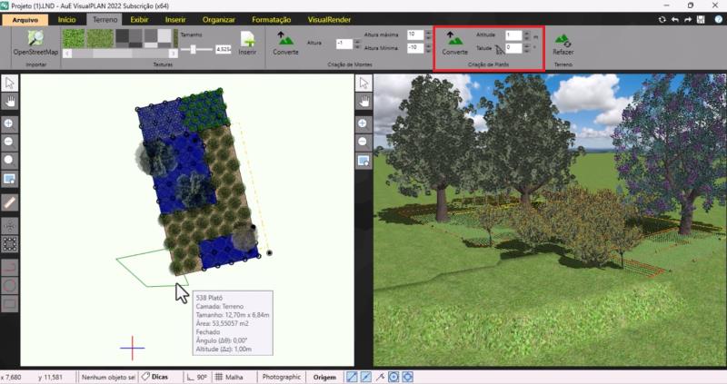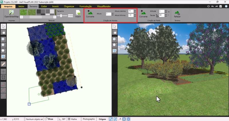 Después de configurar los parámetros deseados, seleccione el polígono y haga clic en Convertir para aplicar la modificación al terreno. Vale la pena recordar que, en la herramienta Montículos, también es posible crear inclinaciones más suaves y redondeadas ajustando los valores de altura mínima y máxima.